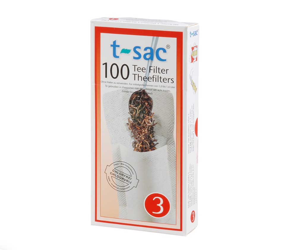 100 chloorvrije, papieren theezakjes van T-sac om zelf te vullen. Deze theefilters hebben een wat langere vulopening, wat het inscheppen vergemakkelijkt.